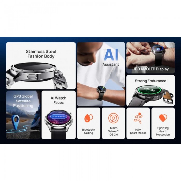 Смарт-годинник Mibro GT оснащений AMOLED-дисплеєм з діагоналлю 1.43 дюйма та роздільною здатністю 466x466 пікселів, що забезпечує чітке зображення з піковою яскравістю до 600 ніт. Корпус з нержавіючої сталі та армованого полімеру витримує занурення до 5 ATM, а вбудовані датчики моніторять пульс, рівень кисню в крові та стрес. Підтримка понад 100 спортивних режимів та GNSS-навігація роблять пристрій зручним для тренувань, а Bluetooth-дзвінки та AI-функції додають повсякденної практичності.