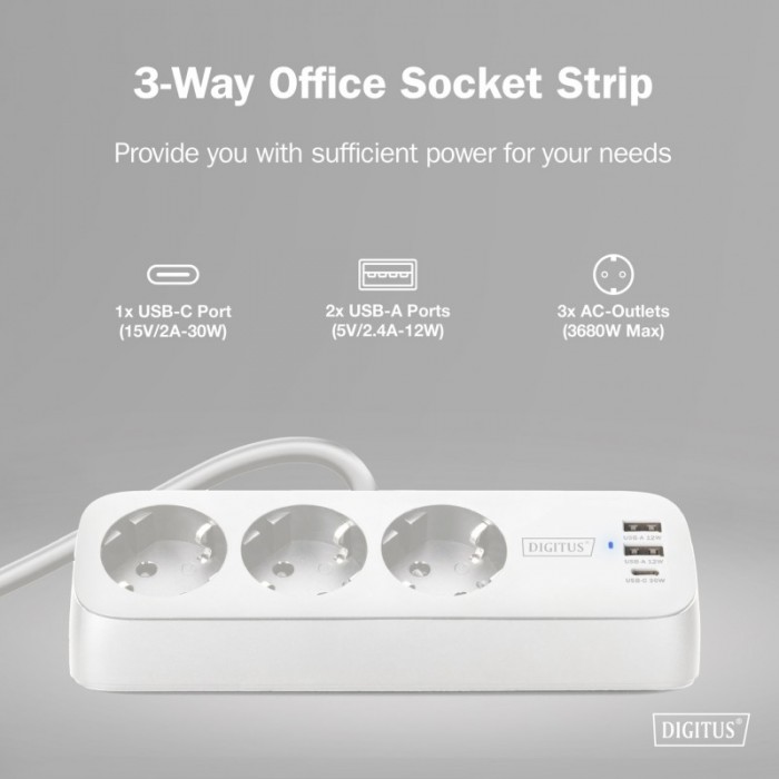 Блок, розеток, DIGITUS, Office, 3xSchuko, 2xUSBA, 1xUSBC, 16A, 15м, вилка, Schuko, білий