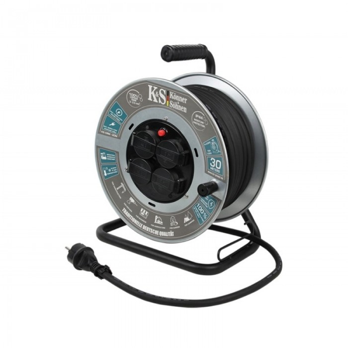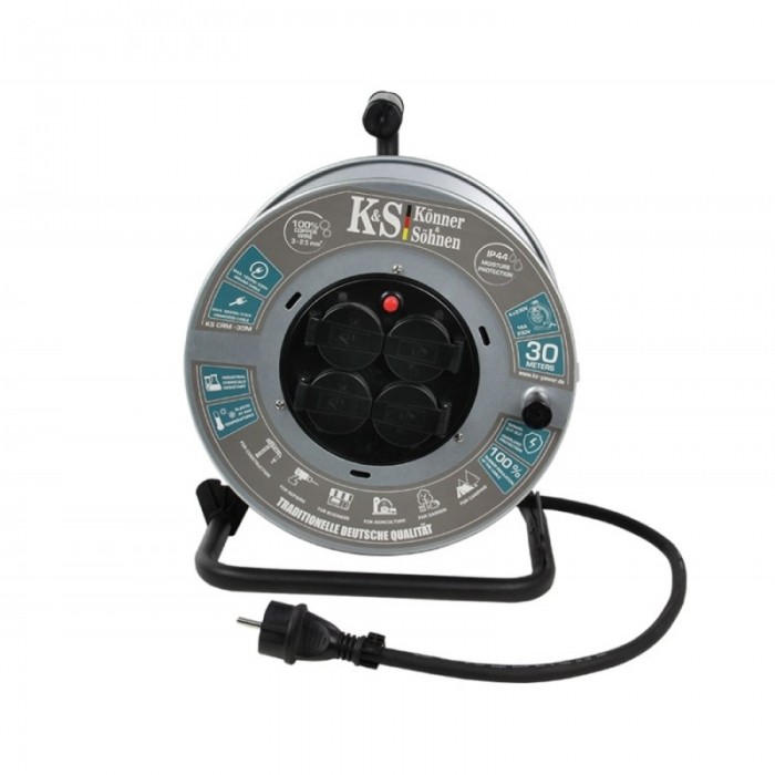 Подовжувач мережевий Konner&Sohnen KS CRM-30M, 30м, 4xТипF, 16A, на котушці, чорний