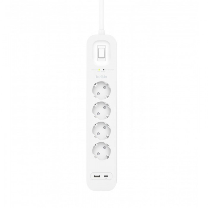 Мережевий подовжувач Belkin з 4 розетками типу F, USB-A та USB-C портами забезпечує зарядку до 18 Вт і захист від імпульсних перенапруг з поглинанням 525 Дж. Кабель довжиною 2 м та підтримка навантаження до 3680 Вт дозволяють підключати потужну техніку. Індикатори захисту та вимикач спрощують контроль стану та використання.