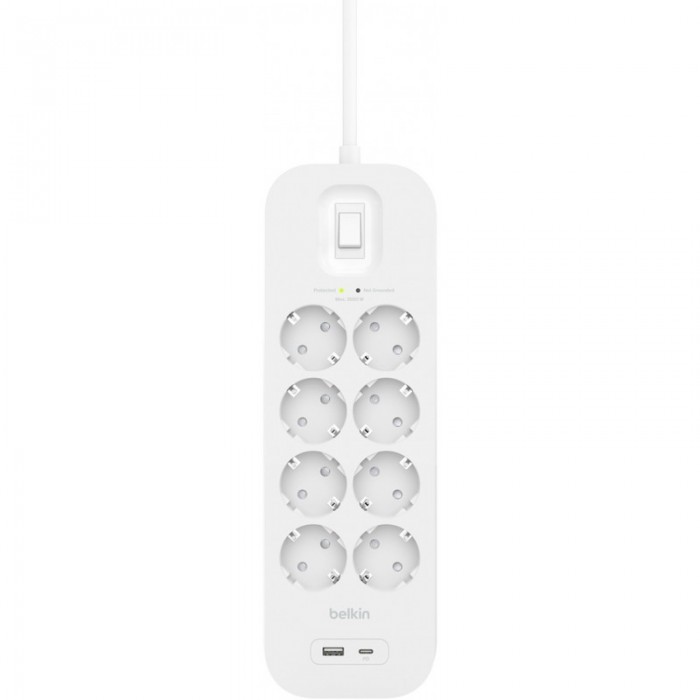 Подовжувач-фільтр мережевий Belkin 8хТип F, 3x1.5мм кв, 16А, USB-A/USB-C 18Вт, з захистом від перенапруги, 2м, білий