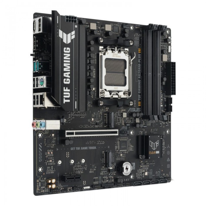 ASUS TUF GAMING A620AM-PLUS — надійна материнська плата формату micro-ATX для процесорів AMD Ryzen серій 9000, 8000 та 7000. Вона поєднує міцну 8+2+1 фазну схему живлення, підтримання DDR5 до 256 ГБ, інтерфейс PCIe 4.0 та два слоти M.2 із високою швидкістю передавання даних. Мережа 2.5 Гбіт, потужне охолодження, Aura Sync і перевірена витривалість TUF забезпечують стабільність у тривалих ігрових сесіях.