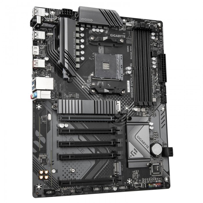 Материнська плата GIGABYTE B550 EAGLE WIFI6 формату ATX для процесорів AMD Ryzen (Socket AM4). Оснащена чипсетом B550, підтримує до 128 ГБ DDR4 у 4 слотах, два M.2 для SSD, 4 SATA, PCIe 4.0/3.0, HDMI, а також сучасні інтерфейси USB. Має вбудований Wi-Fi 6, Bluetooth 5.3, гігабітний LAN та аудіо Realtek 7.1. LED-підсвічування RGB Fusion та Q-Flash Plus забезпечують зручність у використанні.