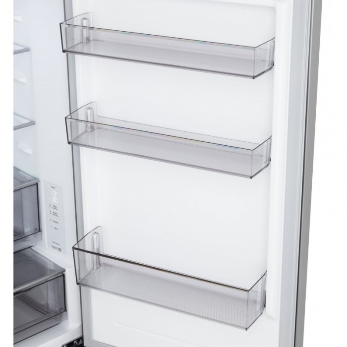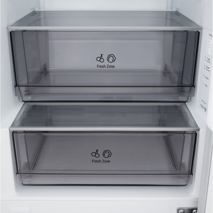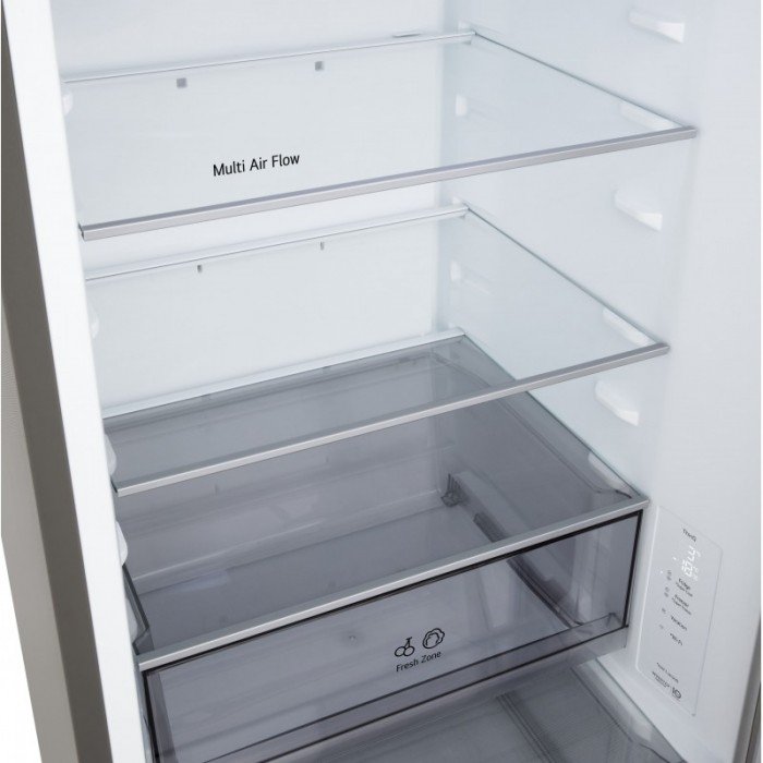 Холодильник LG GC-B459EMYM з нижньою морозильною камерою розподіляє 333 літри об’єму між 220 літрами для свіжих продуктів і 113 літрами для заморожених. Total No Frost у поєднанні з Multi Air Flow підтримує рівномірну температуру без інею на стінках. Інверторний компресор обмежує шум до 35 дБ, а клас E тримає річний показник на рівні 253 кВт·год. DoorCooling+ оперативно охолоджує дверні полиці, ThinQ з Wi-Fi спрощує відстеження через додаток. Внутрішній дисплей і Fresh Zone додають зручності для щоденного зберігання.