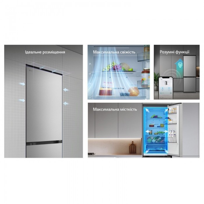 LED освітлення, Експрес заморозка, Експрес охолодження, Багатопотокова система охолодження Multi Air Flow, Антибактеріальний ущільнювач Bio Shield, DoorCooling+, Технологія контролю напруги, Зона свіжості, Сигнал відкритих дверцят, LG ThinQ з керуванням через Wi-Fi, Інтелектуальна система діагностики Smart Diagnosis, Багатопотокова система охолодження морозильного відділення