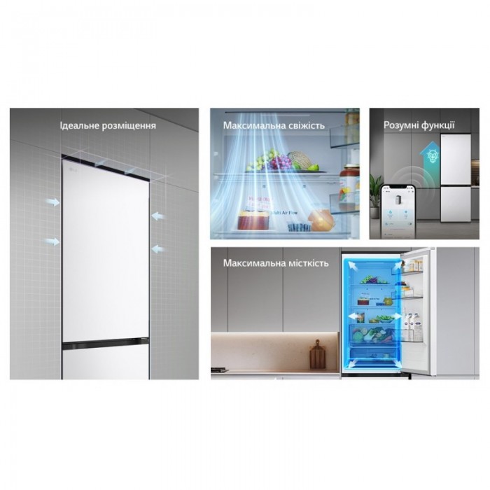 LED освітлення, Експрес заморозка, Експрес охолодження, Багатопотокова система охолодження Multi Air Flow, Антибактеріальний ущільнювач Bio Shield, DoorCooling+, Технологія контролю напруги, Зона свіжості, Сигнал відкритих дверцят, LG ThinQ з керуванням через Wi-Fi, Інтелектуальна система діагностики Smart Diagnosis, Багатопотокова система охолодження морозильного відділення