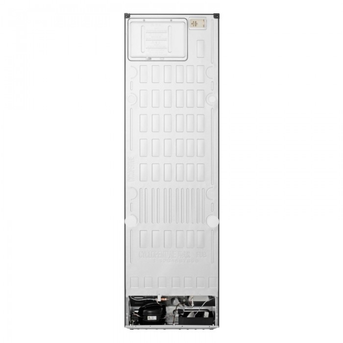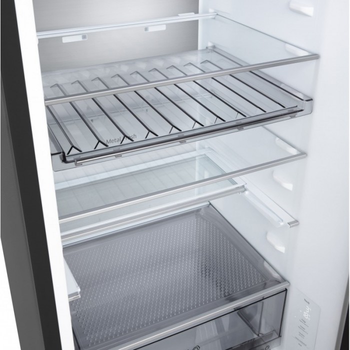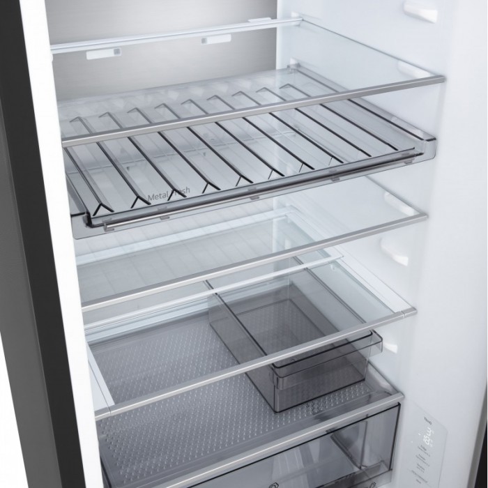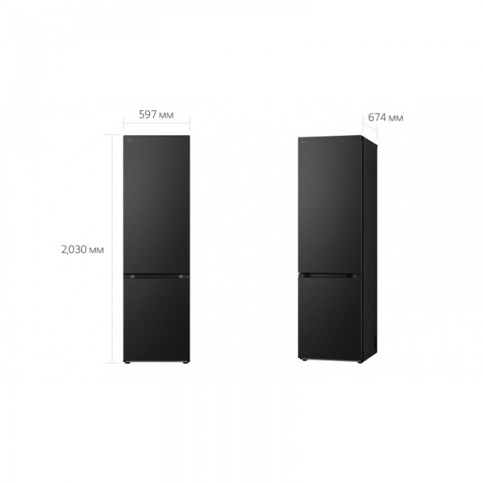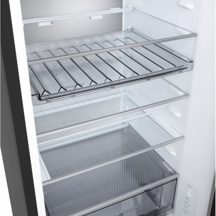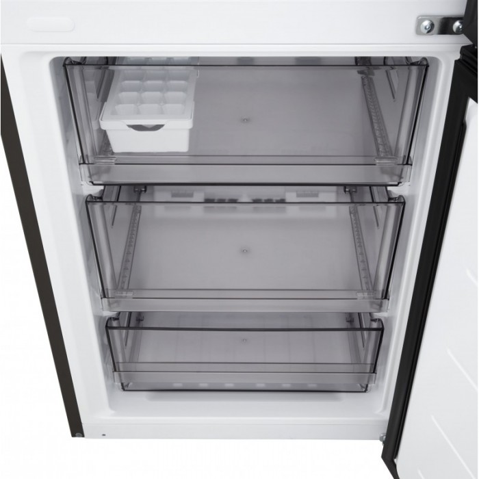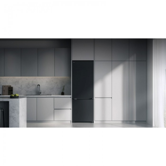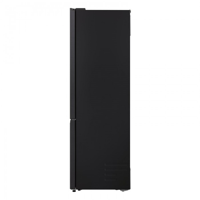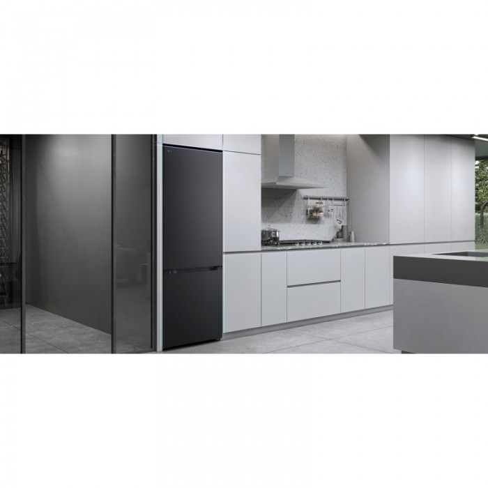 Холодильник LG GC-B509ETSM з нижньою морозильною камерою має корисний об’єм 375 л (262 л холодильне + 113 л морозильне відділення) і належить до енергетичного класу E. Інверторний компресор забезпечує рівень шуму 35 дБ та потужність заморожування 10 кг на добу. Система Total No Frost усуває необхідність розморожування, а Metal Fresh разом із зонами Fresh Converter та Fresh Balancer підтримують оптимальні умови для різних продуктів. Матове чорне покриття корпусу та прихована горизонтальна ручка створюють стриманий сучасний вигляд.