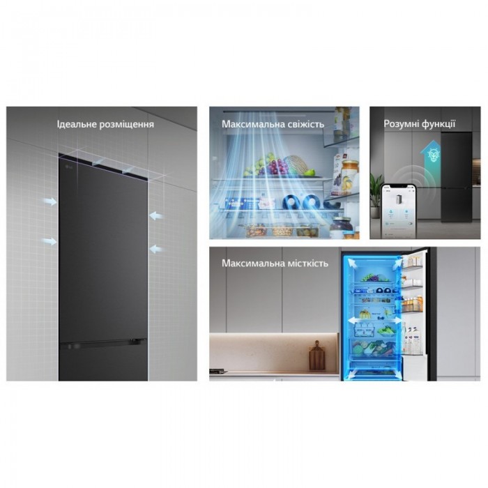 Експрес заморозка, Зона свіжості FRESH Balancer, Зона свіжості FRESH Converter, Експрес охолодження, Багатопотокова система охолодження Multi Air Flow, DoorCooling+, Технологія контролю напруги, Сигнал відкритих дверцят, LG ThinQ з керуванням через Wi-Fi, Інтелектуальна система діагностики Smart Diagnosis