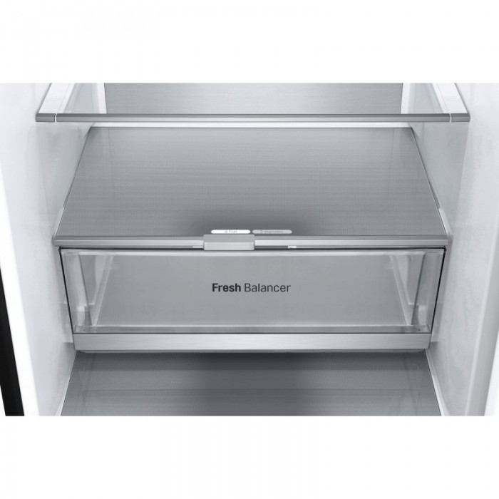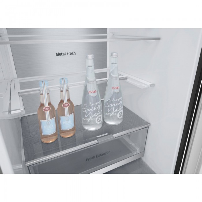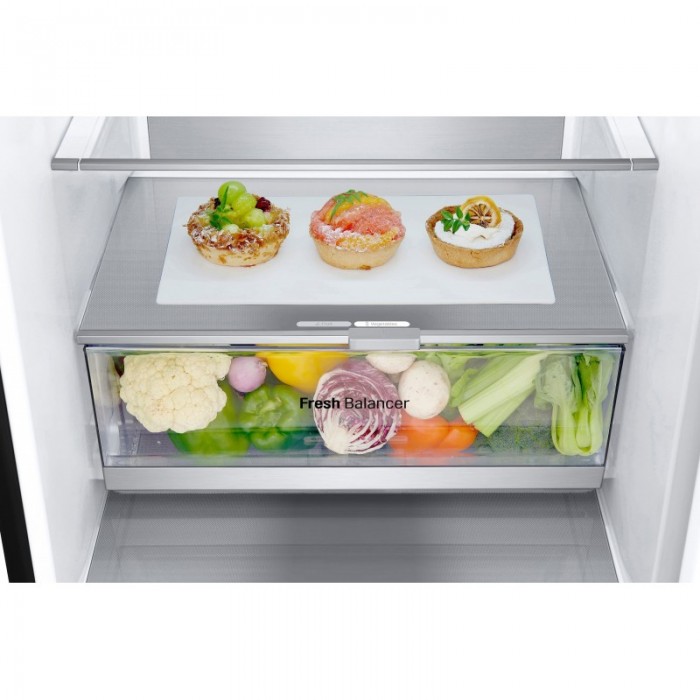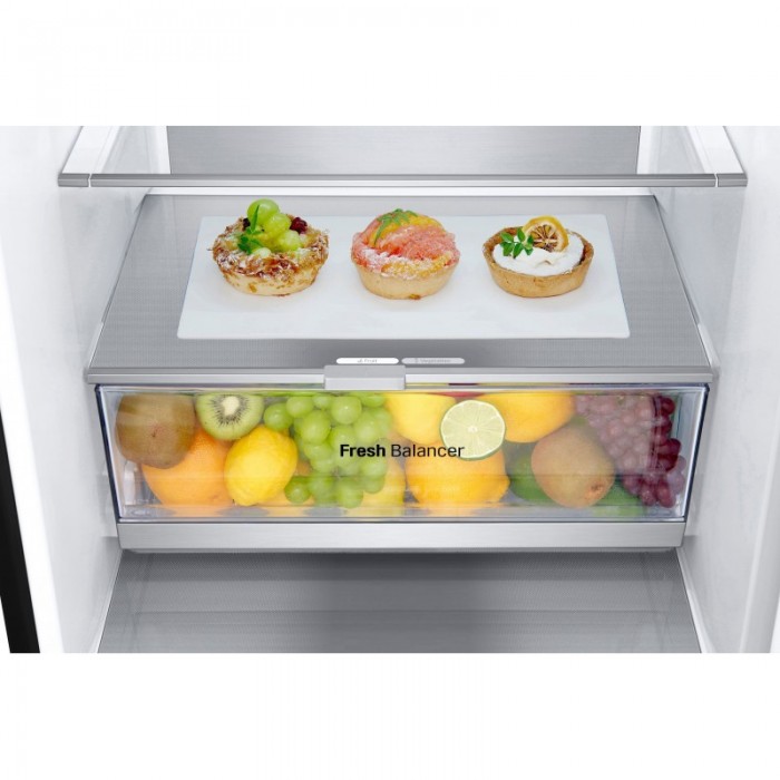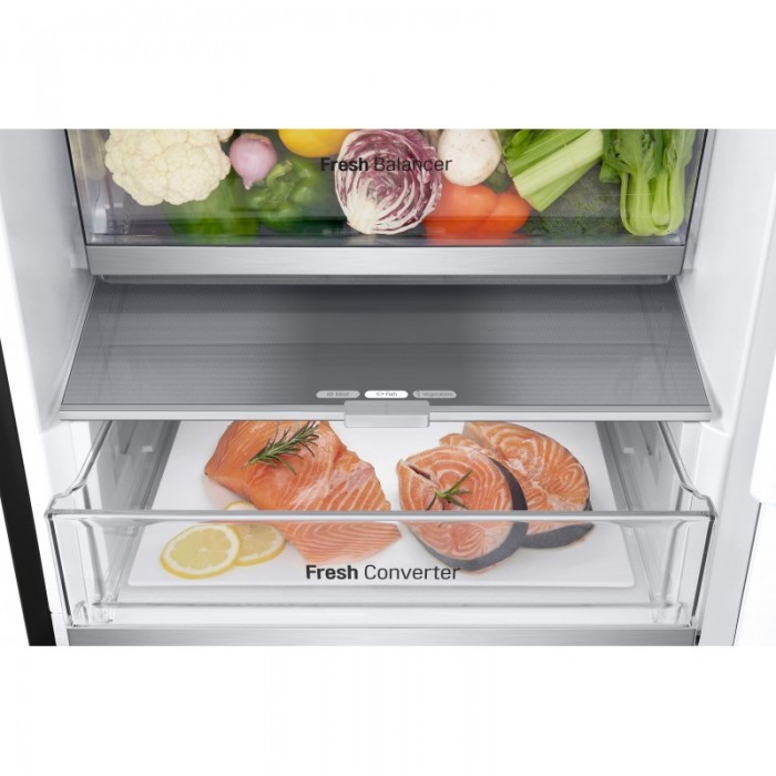 Сучасний холодильник з об’ємом 384 л, нижньою морозильною камерою на 107 л і тихою роботою (35 дБ). Інверторний компресор і технологія Total No Frost забезпечують ефективне охолодження без інею. Оснащений DoorCooling+, зонами свіжості Fresh Balancer і Fresh Converter, Wi-Fi-керуванням LG ThinQ, дисплеєм, LED-підсвіткою та складаною полицею. Енергетичний клас A++, споживання – 288 кВт/рік.