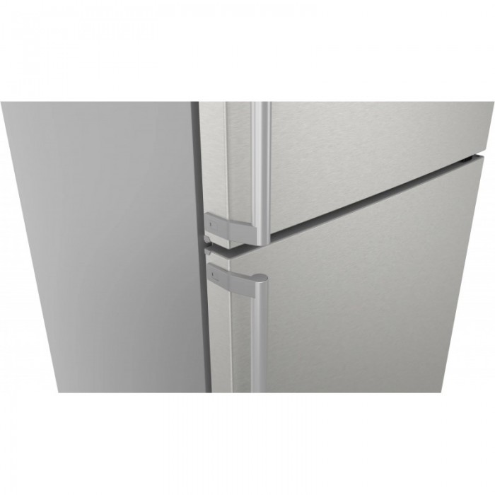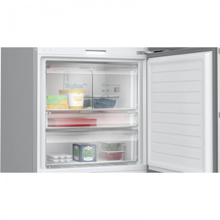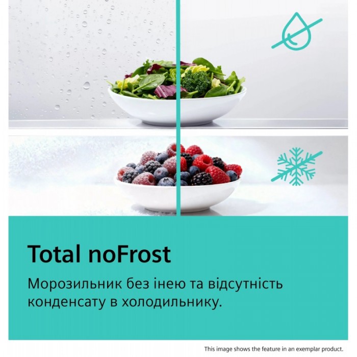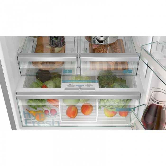 Холодильник Siemens з нижнім розташуванням морозильної камери оснащений системою Total noFrost, зоною hyperFresh plus з регулюванням вологості та багатопотоковою циркуляцією повітря multiAirflow. Використовується світлодіодне освітлення холодильного і морозильного відділень, інверторний компресор та підтримка керування через Home Connect. Також є функції швидкого охолодження та швидкого заморожування для зниження температури на встановлений час під час завантаження продуктів.