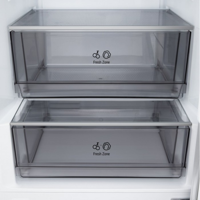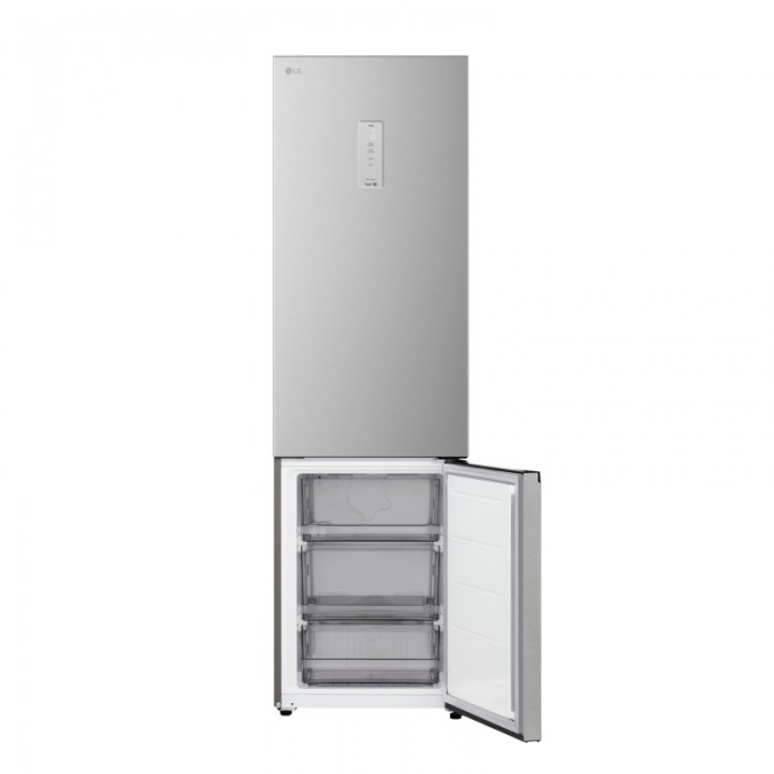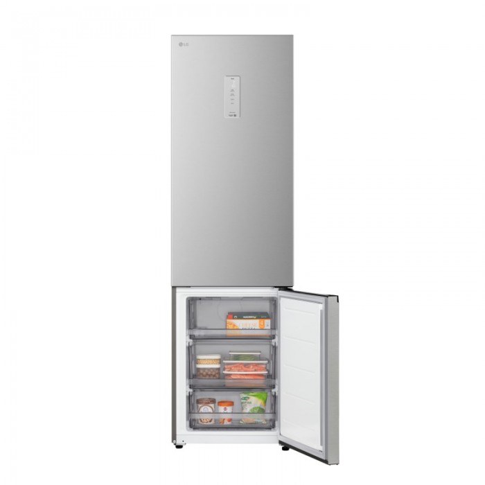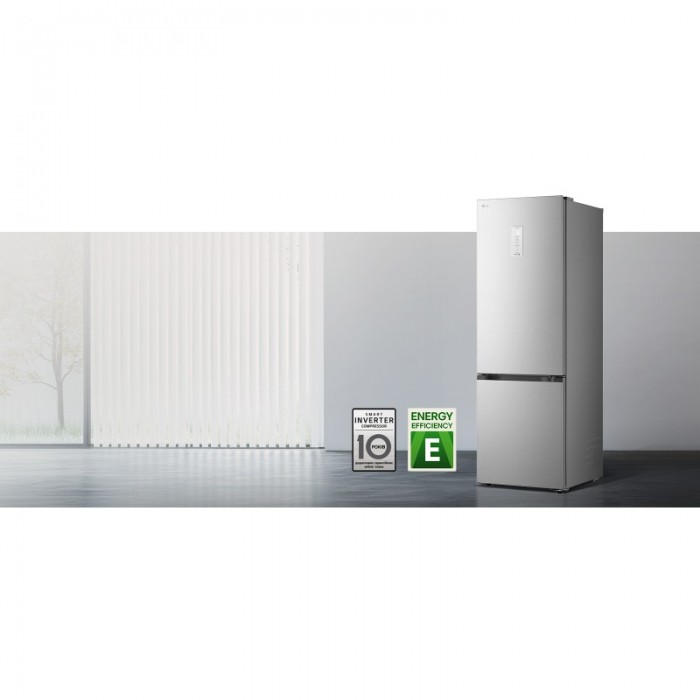 Холодильник LG GC-B509EMLM з нижньою морозильною камерою має загальний корисний об'єм 375 л (262 л холодильне відділення + 113 л морозильне). Пристрій оснащений інверторним компресором, системою Total No Frost, технологією DoorCooling+ та зовнішнім LED-дисплеєм. Зона свіжості Fresh Zone підтримує оптимальні умови для тривалого зберігання продуктів. Річне споживання енергії становить 263 кВт·год (клас E), рівень шуму - 35 дБ. Гарантія - 1 рік повна + 10 років на компресор.