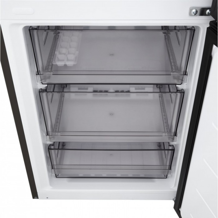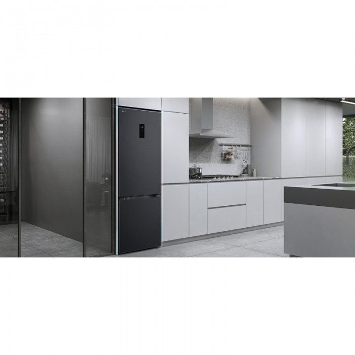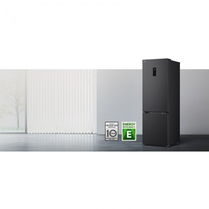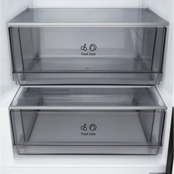 Холодильник LG GC-B509ETLM з нижньою морозильною камерою має загальний корисний об'єм 375 л (262 л холодильне відділення + 113 л морозильне). Пристрій оснащений інверторним компресором, системою Total No Frost, технологією DoorCooling+ та зовнішнім LED-дисплеєм. Зона свіжості Fresh Zone підтримує оптимальні умови для тривалого зберігання продуктів. Річне споживання енергії становить 263 кВт·год (клас E), рівень шуму - 35 дБ. Гарантія - 1 рік повна + 10 років на компресор.