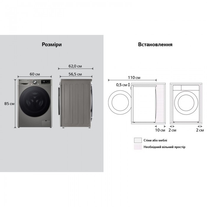 індикатор залишкового часу, Функція ''Додати речі'', Блокування панелі керування від дітей, індикатор етапу циклу прання, індикація незачинених дверцят, індикація помилок у роботі, затримка завершення циклу прання (3-19 годин), автоматичний перезапуск зі збереженням попередніх налаштувань, Функція обробки парою Steam, Збільшений розмір перемикача програм, індикація режиму "Відкласти завершення", індикація режиму "Блокування від дітей", індикація режму "Віддалений старт", Відкриття дверей: праворуч, індикація обраних параметрів програми, загартоване скло дверцят, Удосконалена система зменшення рівня вібрації, Можливість завантажити додаткові програми прання, що завантажуються через додаток LG ThinQ