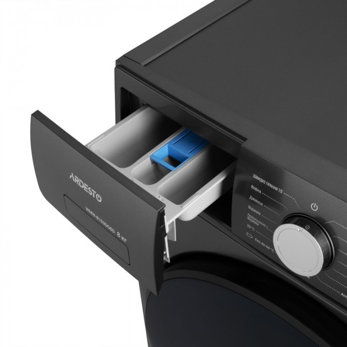 Фронтальна пральна машина ARDESTO Black Mars з інверторним двигуном BLDC вміщує 8 кг білизни та працює зі швидкістю до 1 200 об/хв. Модель вирізняється енергоефективністю класу А+++ та низьким рівнем шуму – 62 дБ під час прання і 75 дБ за віджимання. Передбачено 16 програм, з-поміж яких: «Еко 40–60 °C», «Делікатне прання», «Речі дітей», «Вовна», «Ковдра», «Джинси» та «Швидкий цикл 15'». Функція прання парою освіжає тканини й усуває алергени, а цифровий дисплей, відкладений старт, блокування панелі й можливість додавання білизни під час циклу забезпечують зручність і контроль процесів.