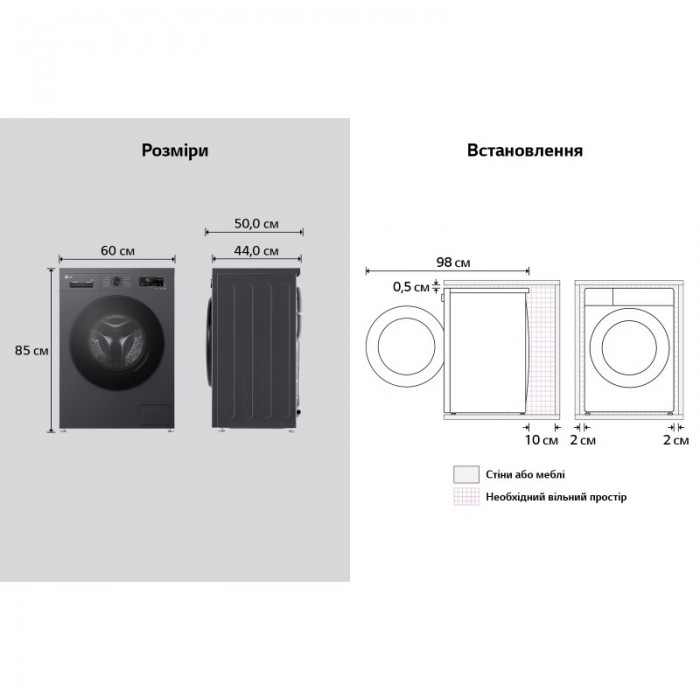 Технологія ''6 рухів турботи'' 6 Motion, індикатор залишкового часу, Система зменшення рівня вібрації, Система контролю піноутворення, Технологія контролю напруги (174-400 В), Блокування панелі керування від дітей, індикація режиму "Блокування від дітей, індикація обраних параметрів програми прання, індикація незачинених дверцят, індикація помилок у роботі, затримка завершення циклу прання (3-19 годин), автоматичний перезапуск зі збереженням попередніх налаштувань, Функція обробки парою Steam, відкриття дверей: праворуч, індикація режиму "Відкласти завершення", індикація режму "Віддалений старт", Завантаження додаткових програм через додаток LG ThinQ™ по Wi-Fi, індикація етапу циклу прання, Віддалене керування через додаток LG ThinQ по Wi-Fi
