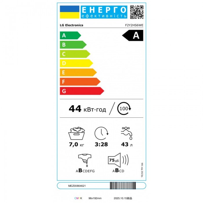 0.444 (за 1 цикл на стандартній програмі), 44 кВт/год (за 100 циклів на стандартній програмі), 0.5 кВт (у вимкненому режимі; в режимі очікування), 4 кВт/год (при відкладеному запуску)