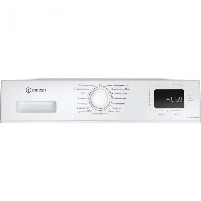 Бавовна, Полоскання, 20°C, Еко бавовна, Вовна/Делікатні тканини, Бавовна з замочуванням, Видалення плям, Змішані тканини, Віджим та злив, Очистка барабана, Повне завантаження - 59 хвилин, Змішані тканини - 59 хвилин, Синтетика - 59 хвилин, Бавовна - 28 хвилин, Експрес - 14 хвилин