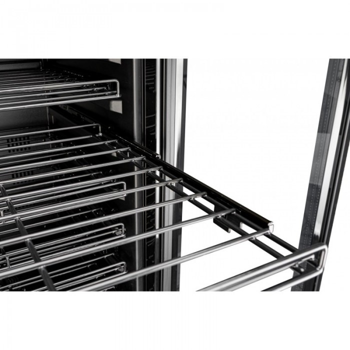 підсвічування, компресор з антивібраційним кріпленням, дротяні полиці LabelView, подвійне скло дверей з УФ-фільтром, вугільний фільтр для нейтралізації запахів, FrostFree - для розміщення в холодних місцях від 5°C, система захисту від обмерзання WinterCare