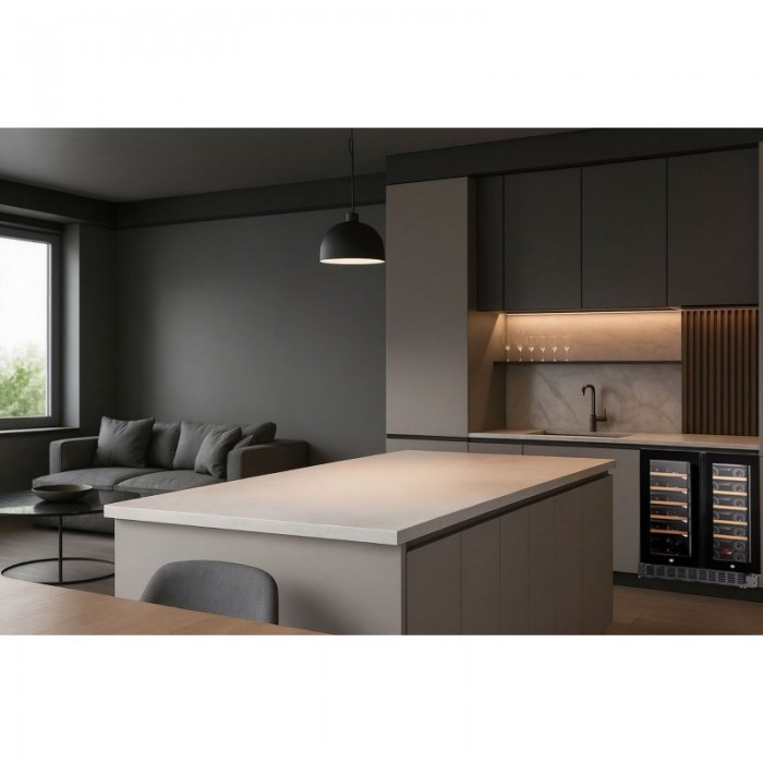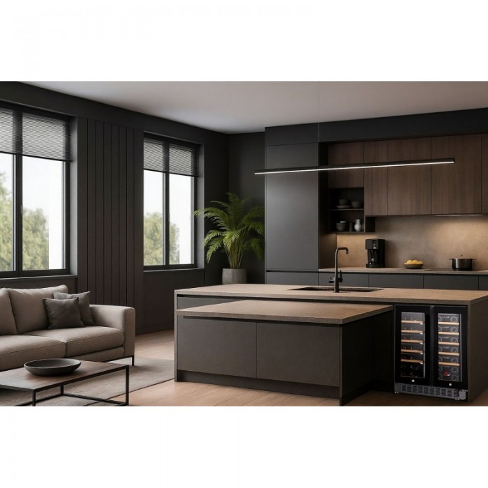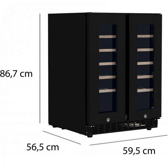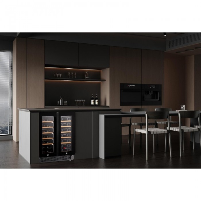 Philco PW40GDC — компактний двозонний винний холодильник на 40 пляшок (116 л) з дерев’яними полицями, сенсорним керуванням і діапазоном 5–20 °C в обох зонах. Чорний корпус, подвійне скло з УФ-фільтром, антивібраційний компресор, вугільний фільтр, WinterCare (працює від +5 °C) і контейнер для підтримки вологості. Ідеальний для квартири, невеликого ресторану чи офісу — висота лише 87 см дозволяє ставити під стільницю.