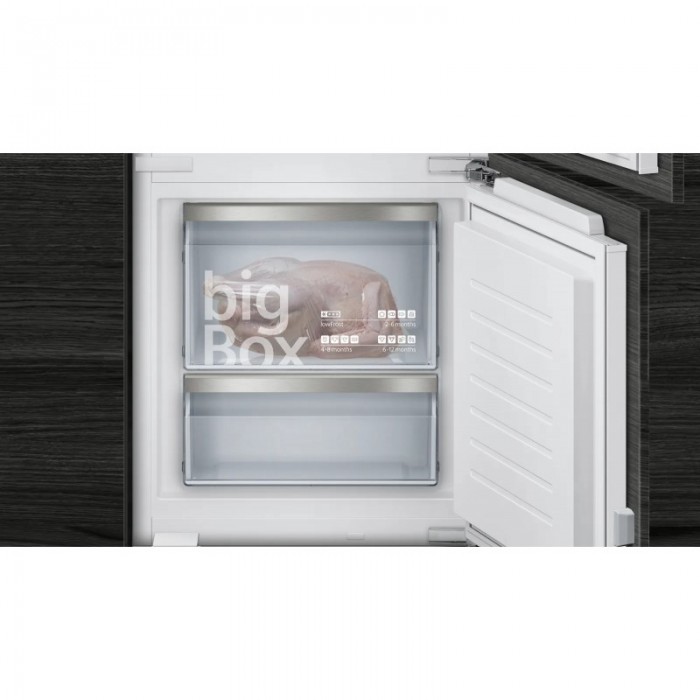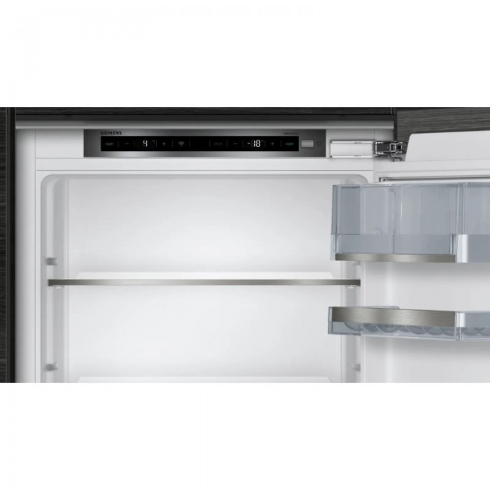 Вбудований холодильник Siemens iQ500 з нижньою морозильною камерою поєднує зону свіжості hyperFresh plus для овочів і фруктів, технологію lowFrost для рідшого та простішого розморожування, рівномірне LED-освітлення та місткий контейнер bigBox у морозильному відділенні. Рухома скляна полиця полегшує доступ до продуктів і дає змогу швидко оцінити вміст холодильника. Гнучка організація полиць і контейнерів допомагає раціонально використати простір і підтримувати порядок усередині.