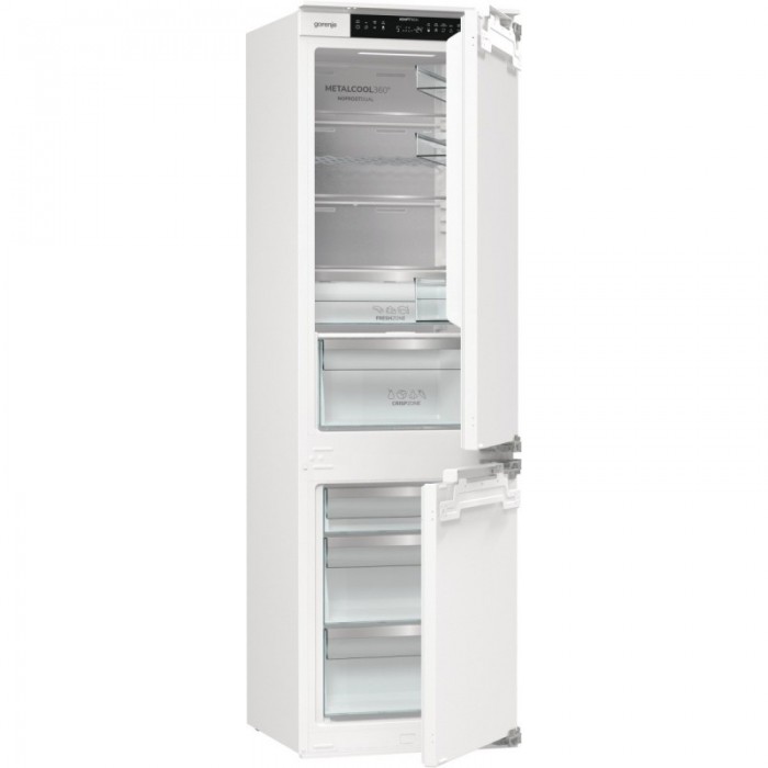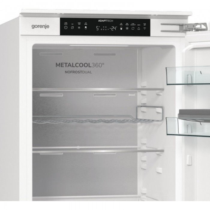 Вбудований холодильник Gorenje NRKI517E82WF поєднує холодильну та морозильну камери в корпусі висотою 177 см. Загальний корисний об’єм становить 244 л, морозильне відділення розташоване знизу. Система NoFrost Plus, адаптивне охолодження AdaptTech та зона свіжості підтримують стабільний мікроклімат для різних типів продуктів. Передбачене Wi-Fi керування та окремий світлодіодний дисплей.