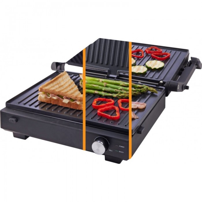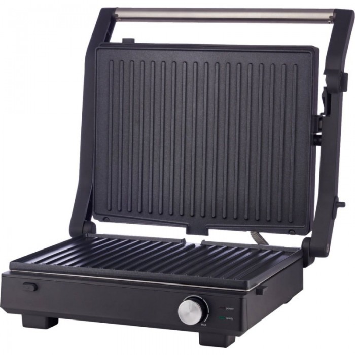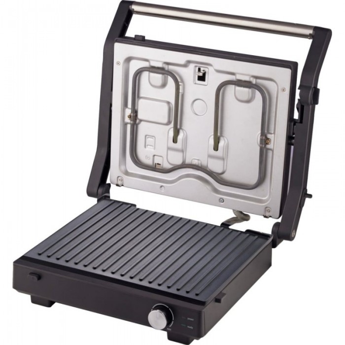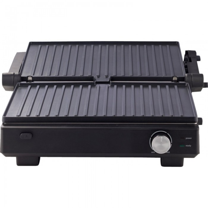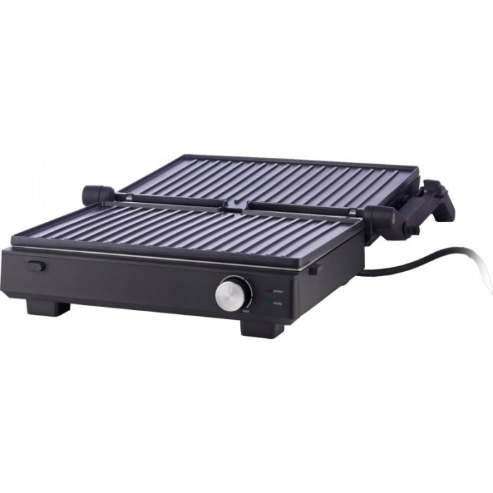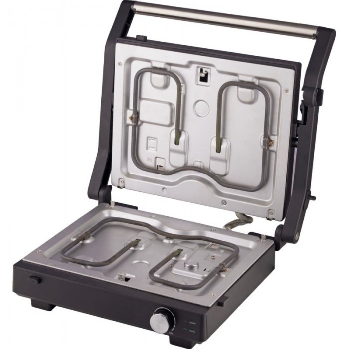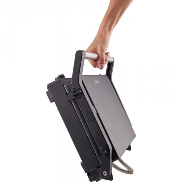 Холодні ручки, Ручка для перенесення, гумові ніжки, Пластини з антипригарним покриттям, Відкриття на 180°, Знімна одностороння панель, Стандартний трубчатий нагрівач, Захисна защіпка, можливість вертикального зберігання, Дренажний отвір та лоток для збору залишків масла
