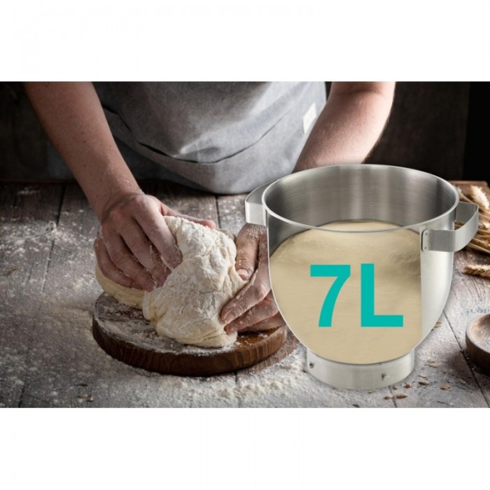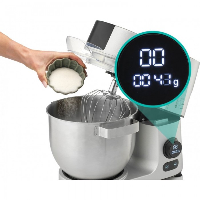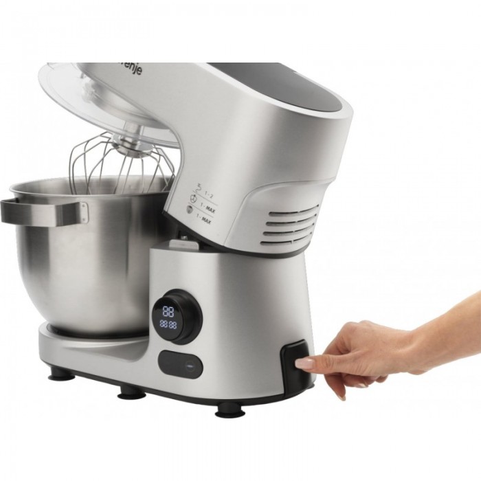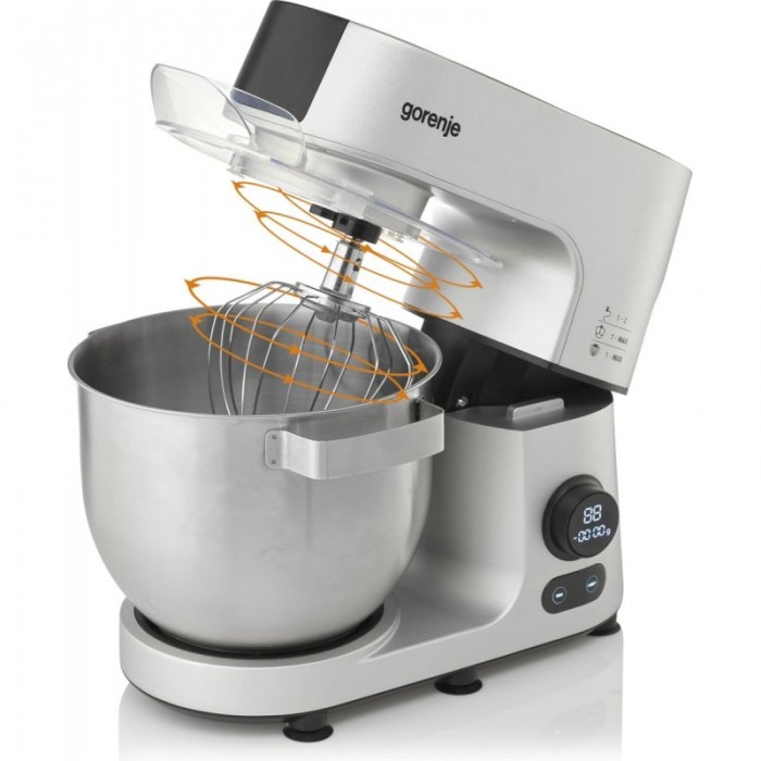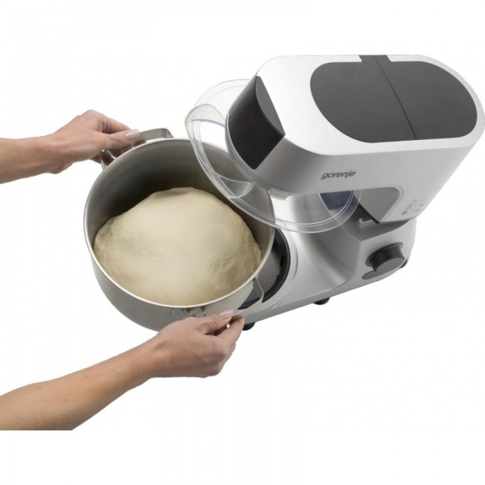 Кухонна машина Gorenje поєднує замішування, змішування та збивання в одному приладі з цифровим керуванням швидкістю. Двигун потужністю 1500 Вт працює з плавним запуском для стабільної роботи під навантаженням. Чаша з нержавіючої сталі об’ємом 7 л розрахована на великі порції тіста та кремів. У комплекті передбачені основні насадки й додаткові аксесуари для нарізання, подрібнення та приготування фаршу.
