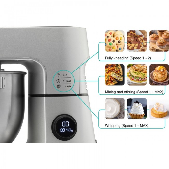 захисний вимикач, блокування двигуна для додаткової безпеки, закриті деталі двигуна, захисна кришка, плавний запуск двигуна, захист від повторного увімкнення для безпеки на кухні, металева система шестерень, цифрове керування швидкістю, автоматичне регулювання обертів