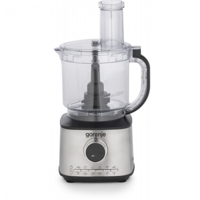 Кухонний комбайн Gorenje 2-в-1 з Fusion Mode: комбайн і блендер в одному, 12 автопрограм (6 кнопок) та 10-швидкісний регулятор. AC-двигун 1500 Вт, чаша 2,0 л, глечик 1,75 л, LED-дисплей. Повний набір насадок, знімні деталі придатні для миття в посудомийці, є блокування та захист від перегріву.