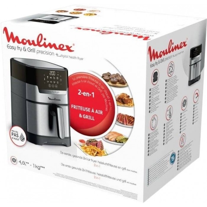 Мультипіч Moulinex EasyFry&Grill Digital з потужністю 1550 Вт та чашею 4,2 л забезпечує приготування на 6 порцій. Технологія Extra Crisp з циркуляцією потоків гарячого повітря та робочою температурою 80-200 °C. Сенсорне керування з 8 автоматичними програмами: картопля фрі, курка, нагетси, риба, м'ясо, піца, овочі, десерт, плюс 2 ручних режими аерофритюр та гриль.