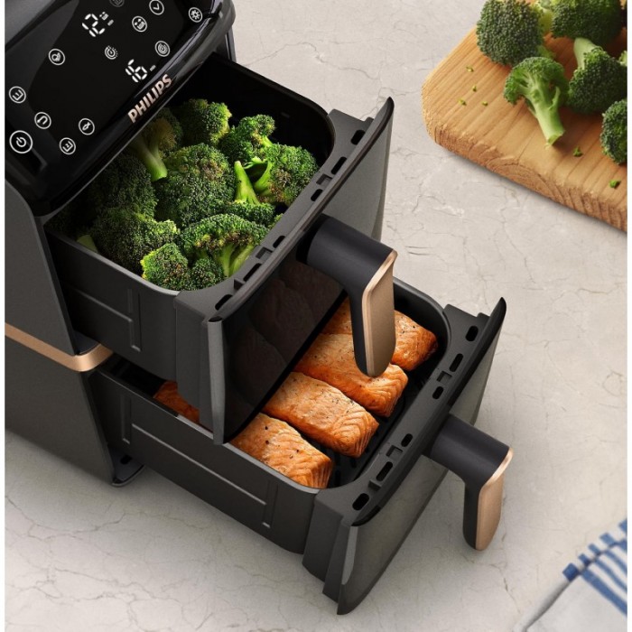 Мультипіч Philips Stacked Dual NA462/70 — це компактна двоярусна аерофритюрниця з подвійним кошиком по 5 л кожен, яка дозволяє готувати дві страви одночасно. Потужність 2300 Вт і технологія RapidAir забезпечують рівномірне приготування з хрусткою скоринкою та мінімальною кількістю олії. Пристрій оснащено сенсорним управлінням, 6 автоматичними програмами та інтелектуальною синхронізацією часу. Завдяки ергономічній конструкції займає на 45% менше місця на кухні.