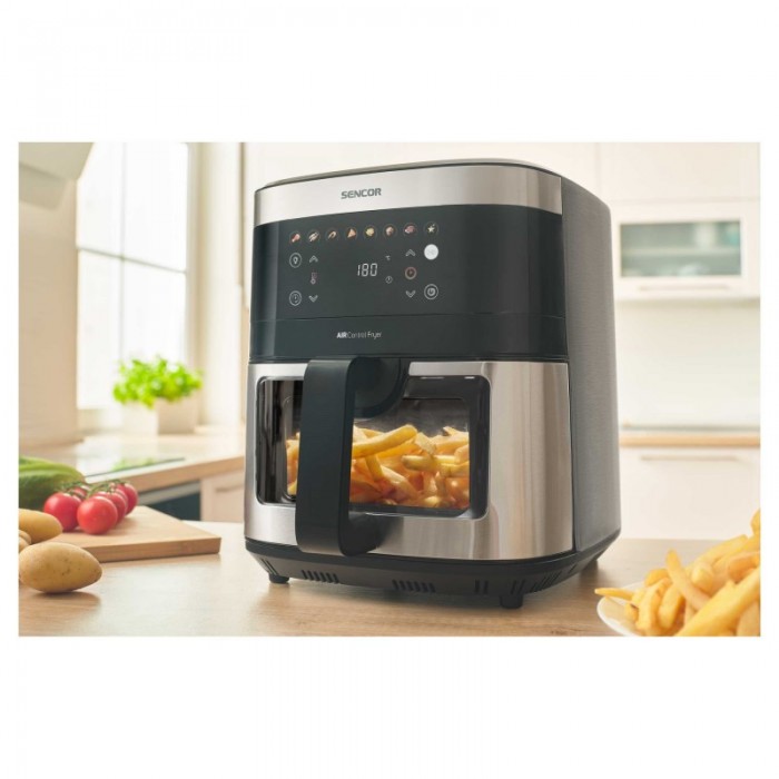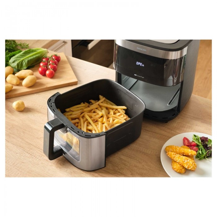 Оглядове вікно, Відкладений запуск, Система смаження без олії, Знімна решітка для кошика з антипригарним покриттям для легкого чищення, Таймер на 60 хвилин, Функція «Струшування»