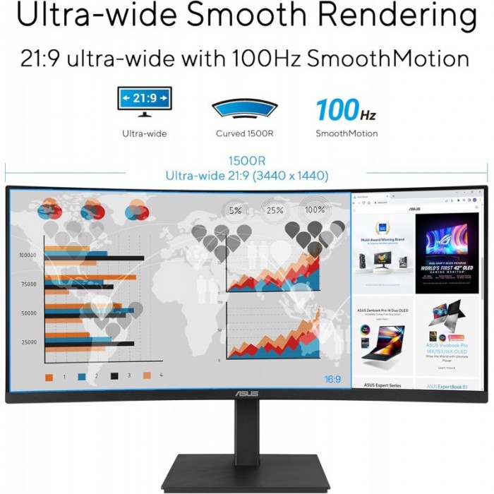 Монітор Asus 34" VA34VCPSR HDMI, DP, USB-C, 3xUSB, RJ-45, MM, VA, 3440x1440, 21:9, 100Hz, 4ms, CURVED, AdaptiveSync, HAS