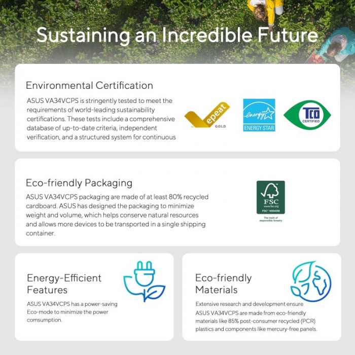 Energy Star, EPEAT Gold, TCO Certified, TÜV Flicker-free, TÜV Low Blue Light, FSC MIX