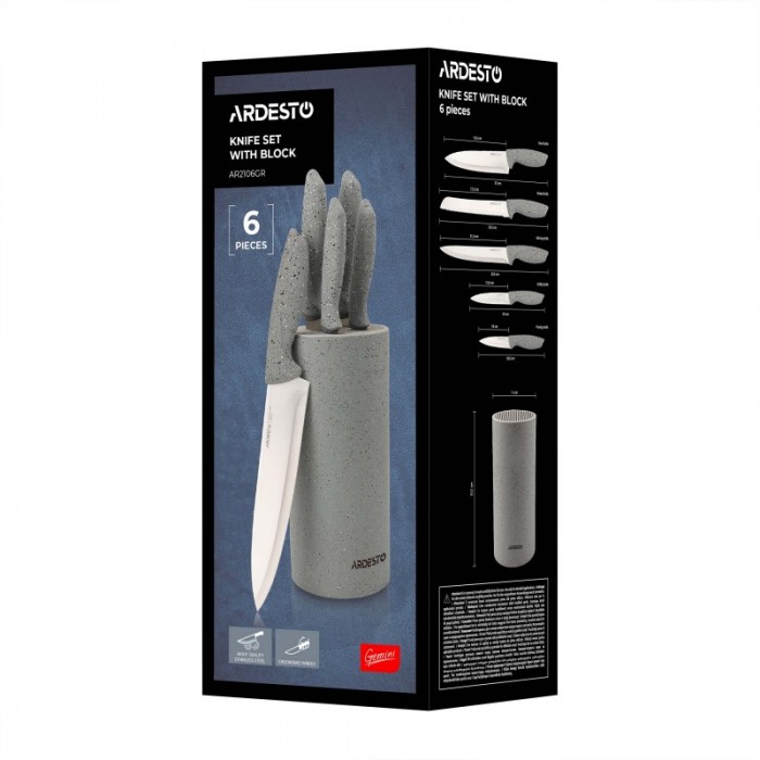 Набір, ножів, з, блоком, Ardesto, Gemini, 6, предметів, нержавіюча, сталь, пластик, сірий