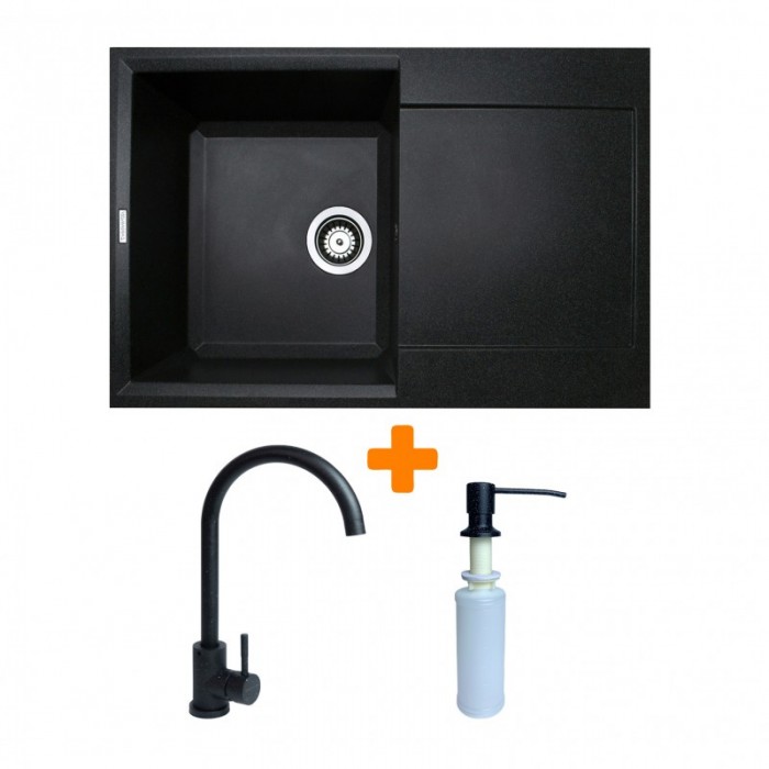 Набір кухонний Adamant Horizon, штучний камінь, прямокут., з крилом, 780х495х230мм, чаша - 1, врізна, чорний + змішувач та дозатор