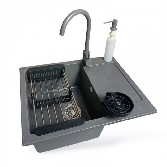 Набір, кухонний, Adamant, Minimal, штучний, камінь, прямокут, з, крилом, 615х495х200мм, чаша, 1, врізна, сірий, змішувач, дозатор, ополіскувач, склянок, коландер