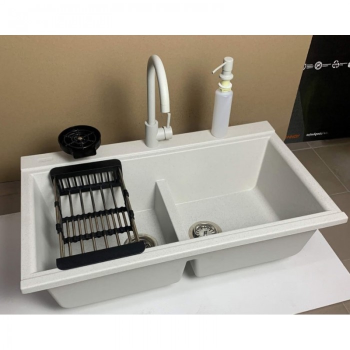 Набір кухонний Adamant Similar, штучний камінь, прямокут., без крила, 885x505x230мм, чаша - 2, врізна, Old stone + змішувач + дозатор + ополіскувач склянок + коландер