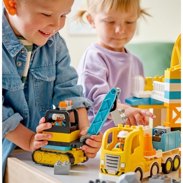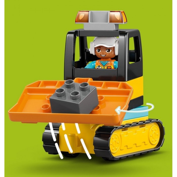 Познайомте маленьких будівельників із набором «3-в-1 Будівельний майданчик і техніка» (10476), де будівництво ніколи не зупиняється! Малюки віком від 3 років занурюються в захопливу будівельну гру, завантажуючи й розвантажуючи вантажівки, піднімаючи та переміщуючи валуни та кубики за допомогою різноманітних будівельних вантажівок LEGO® DUPLO®. Малюки можуть побудувати бульдозер з підйомним ковшем, іграшковий самоскид із функцією перекидання, бетономішалку з барабаном із барабаном, що обертається, а також кран із рухомою стрілою й ковшем на шарнірі. З кубиків також можна побудувати високий кран, завантажувальну станцію, по якій можуть їздити вантажівки, та міст, під яким їздитимуть авто.