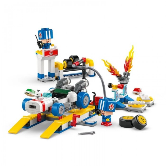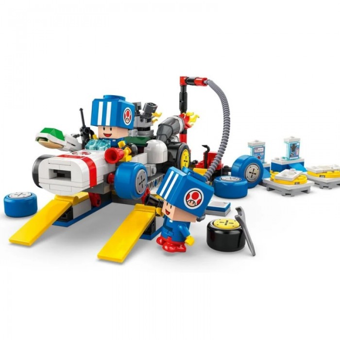 Конструктор LEGO Super Mario Mario Kart – Toad's Garage 72035 відтворює майстерню технічної команди з всесвіту Mario Kart. Набір із 390 деталей дозволяє зібрати гараж, карт B Dasher та обладнання для обслуговування транспорту. У комплект входять дві фігурки Blue Toad у формі механіків і аксесуари для підготовки до перегонів. Конструкція передбачає зміну шин, двигуна та інших елементів картингу. Набір підтримує інтерактивну взаємодію з фігурками LEGO Mario, Luigi або Peach (продаються окремо).