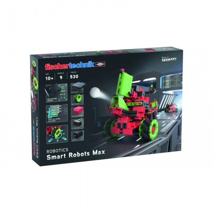 fischertechnik Smart Robots Max працює з контролером fischertechnik RX та програмним забезпеченням ROBO Pro Coding, щоб оживити 9 захоплюючих моделей. Графічне програмне забезпечення не залежить від жодної конкретної операційної системи та може використовуватися на мобільних пристроях. Від простих моделей для початківців до різноманітних роботів на колесах і кумедного танцюючого робота – тут кожен знайде щось для себе. Однією з головних переваг цього набору є омніколеса, які приводяться в дію чотирма двигунами і дозволяють роботу рухатися в будь-якому напрямку. Датчик руху, датчик жестів і кнопка дають змогу створювати та програмувати різноманітних захоплюючих роботів, які просто чекають, поки розробники та винахідники відправлять їх у нову пригоду.