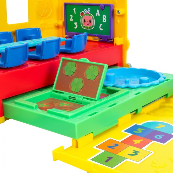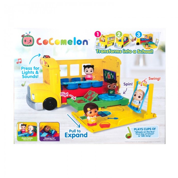 Приєднуйтеся до Джей Джея та Коді під час веселого дня в школі з CoComelon Transforming School Time Bus! Цей автобус-трансформер 2-в-1 містить 6 ігрових зон, включаючи класну кімнату та дитячий майданчик!