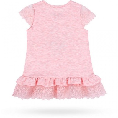 Комфортне плаття А - силуету приємного персикового меланжевого кольору з коротким рукавом, виконано з м'якого і легкого турецького трикотажу. Сукня з коротким рукавчиком з евросеткі, розшитій квітковим візерунком. Таке ж мереживо пришито і по низу сукні. Прикрашає плаття оригінальний принт фігурки танцюючої балеринки. Горловина еластична, оброблена трикотажной бейкой.
